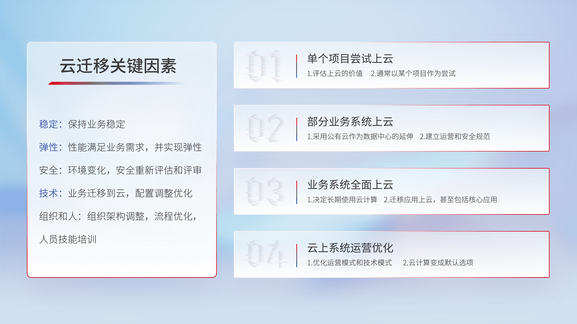 结合实际业务,,,从规划设计、、云平台选型、、、云原生改造、、数据迁移、、集成交付,,迁移全过程为客户识别最佳上云路径,,,,做好风险识别管理,,,,设计网络架构、、、身份权限、、、安全审计合规、、操作审计、、、、日志审计、、、监控告警策略、、、多站点容灾设计等,,,对云上基础设施进行整体规划,,,提升IT治理水平,,以满足弹性、、、、高可用、、高性能的需求。。。。