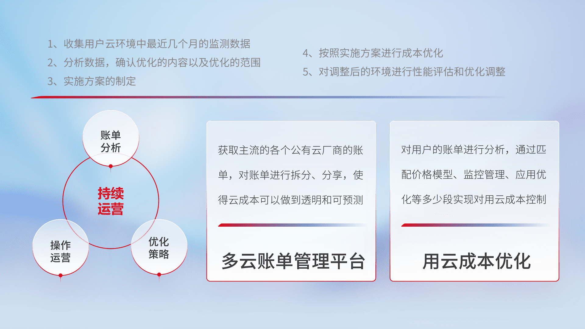 通过多云纳管,,,,以统一的资源数据模型把客户的云资源进行抽象和封装,,,进而实现对多云资源的统一操作,,,,保障云资源管理的可靠性、、稳定性与可用性。。。量身定制化运维内容,,,配置、、、、开发运维、、、补丁管理、、、、备份、、、监控、、、认证和访问管理、、审计和日常巡检等,,,保障在用云过程中的可靠度,,,稳定度以及高可用率。。